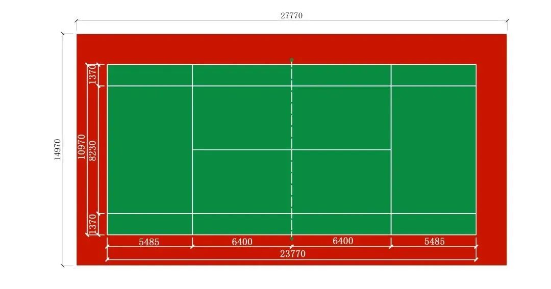 单打主场:长13.4米×宽5.18米,面积69.412㎡室内要求高度不低于9米