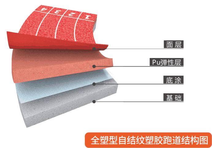 自结纹塑胶跑道是一种新型无颗粒型跑道,以运动生物力学为依据,设计有独特的闭孔性微泡弹性夹层,既能减缓运动员脚步着地时对人体各关节产生的冲击力,又能使人体获得源源不断向前的动能。达到国际田联最新颁布的冲击吸收率的达标要求35%~50%。