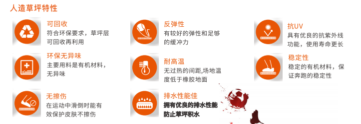 人造运动草坪有外观鲜艳,排水性能好,使用寿命长,维护成本低等特点。能有效减少对运动者皮肤的擦伤和灼伤,加筋结构不仅增加了草苗的挺拔度,进一步提高了草坪的仿真效果,草苗高度一般为50MM。普遍适用于:足球场、曲棍球场、橄榄球场、门球场及多功能运动场等场地。